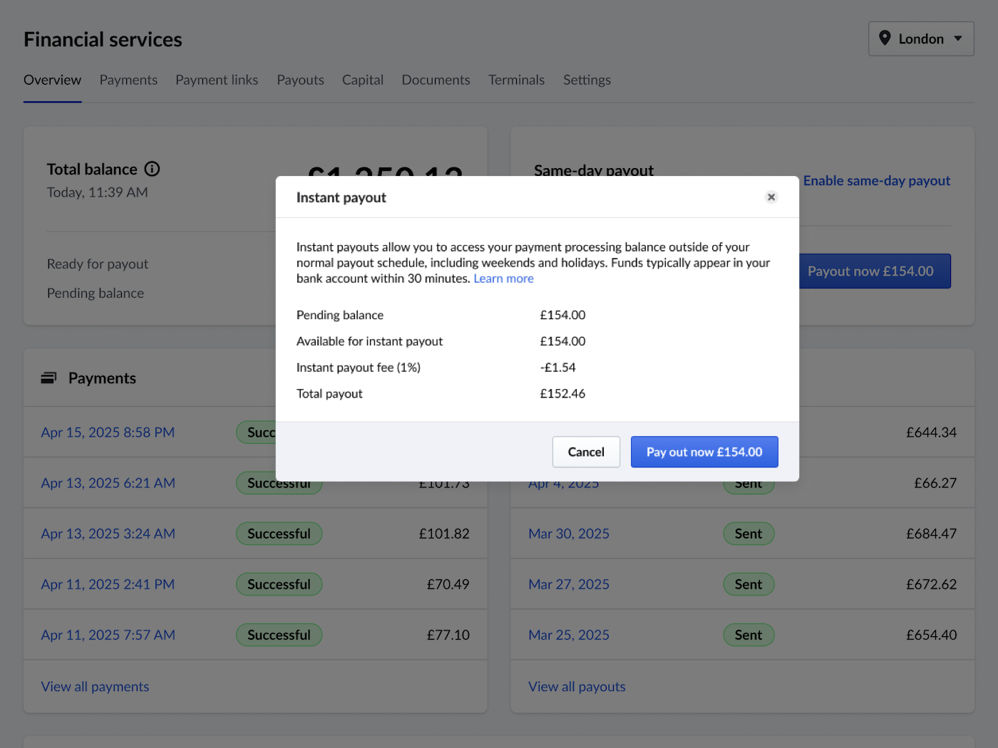 - Same-day: An instant payout configured to pay out automatically at a set time each day. Funds are paid out within 30 minutes.